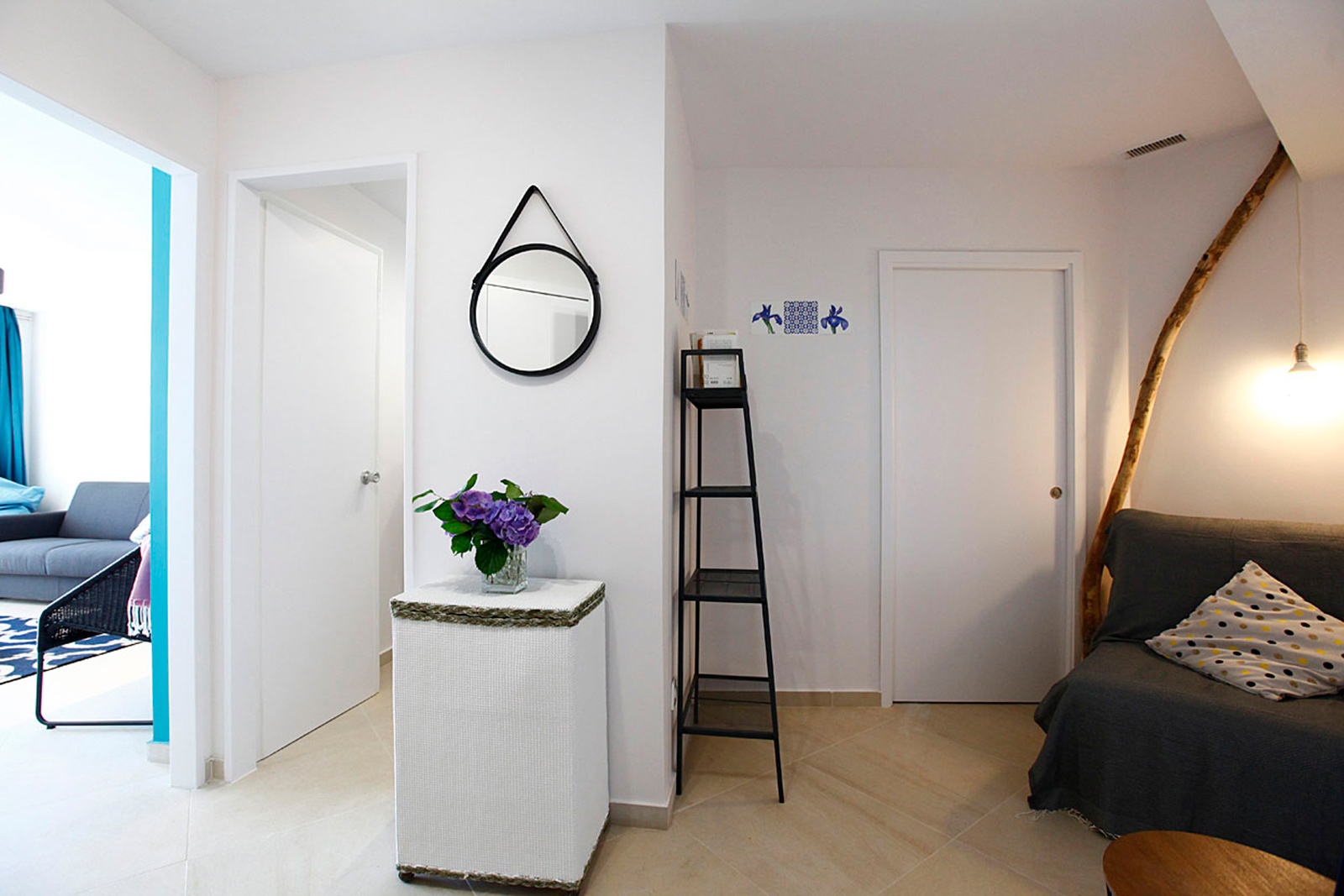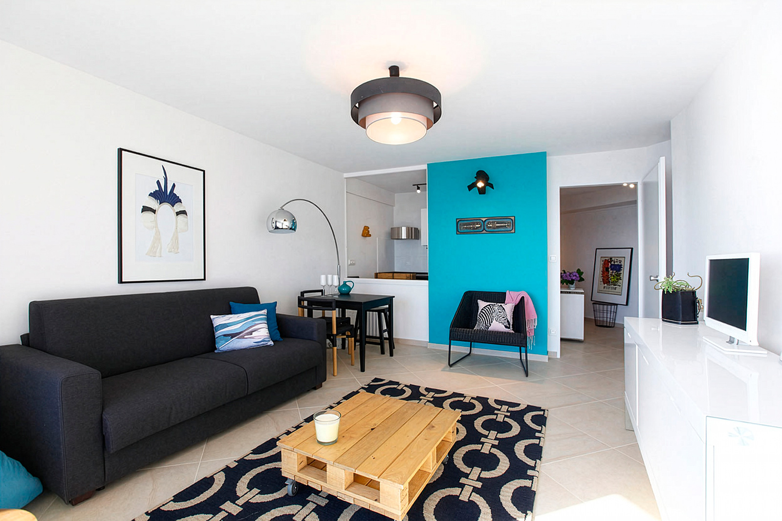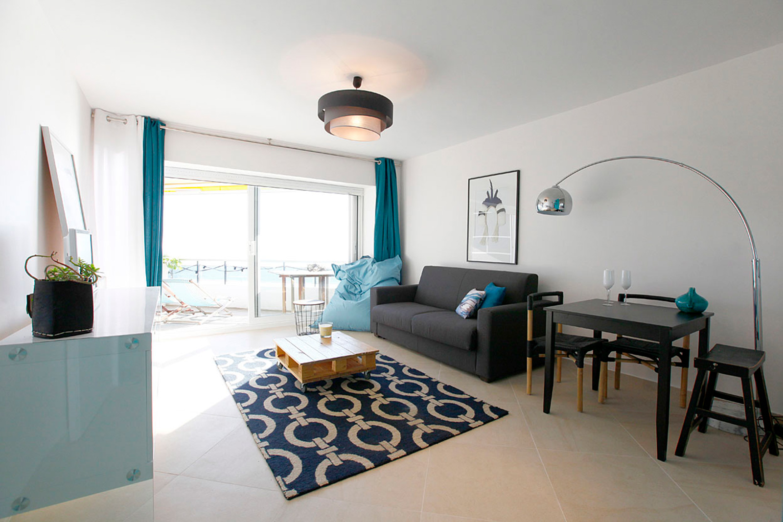 Aplicación de un color azul intenso en la zona de la sala, buscando un contraste con el mar.