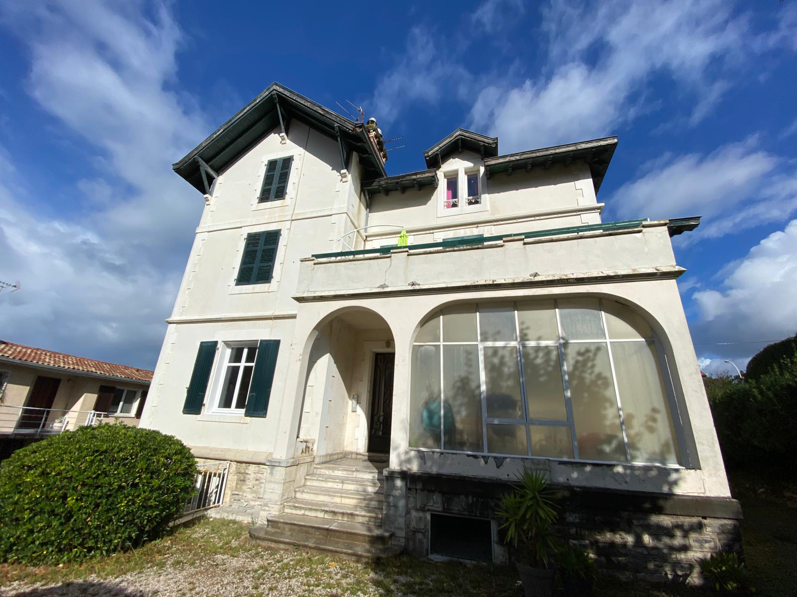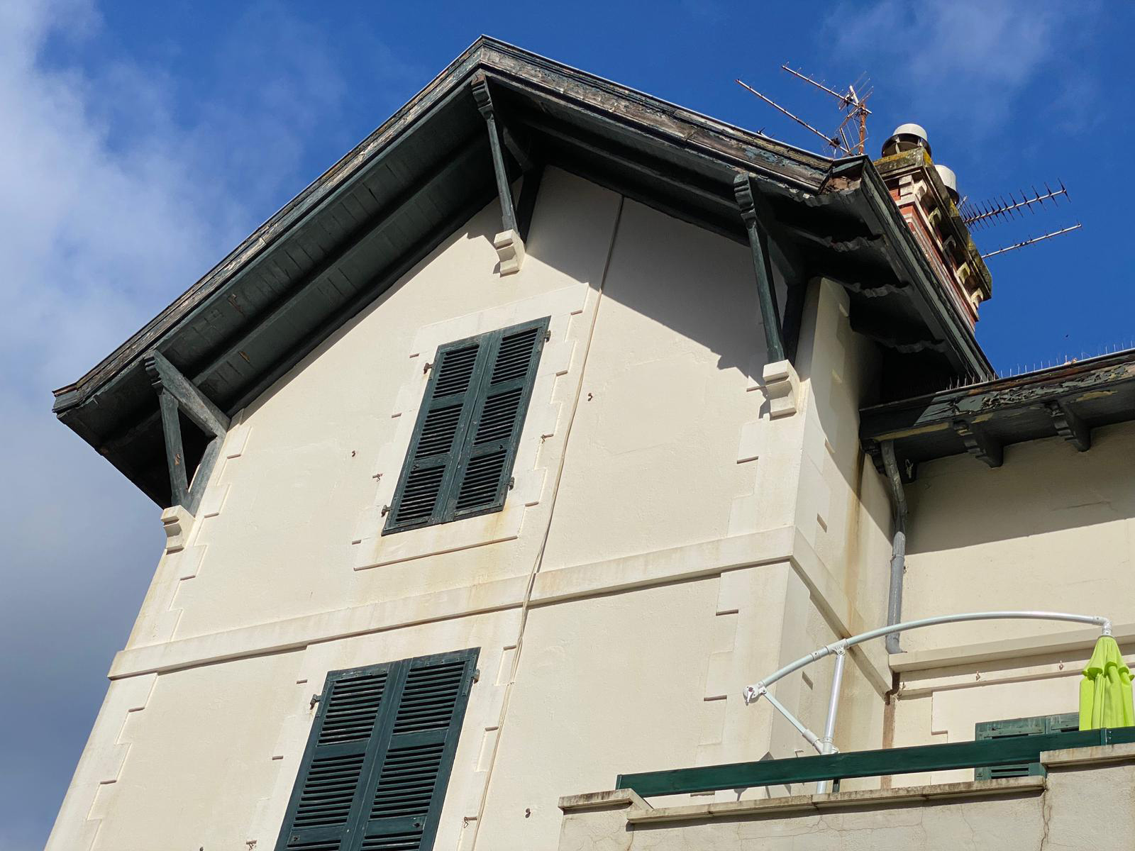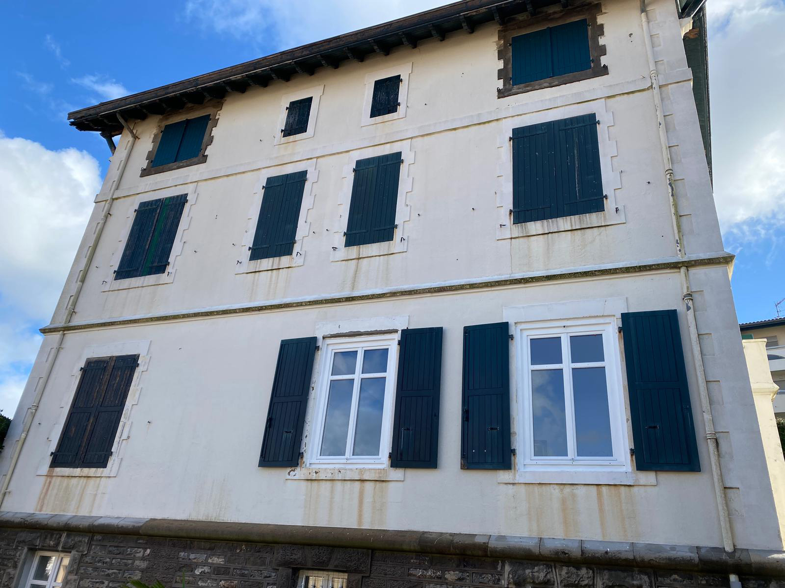Edificio de viviendas en Biarritz con fachada que presentaba desgaste por el paso del tiempo, con pintura deteriorada y necesidad de reparación en carpinterías y elementos comunes.
