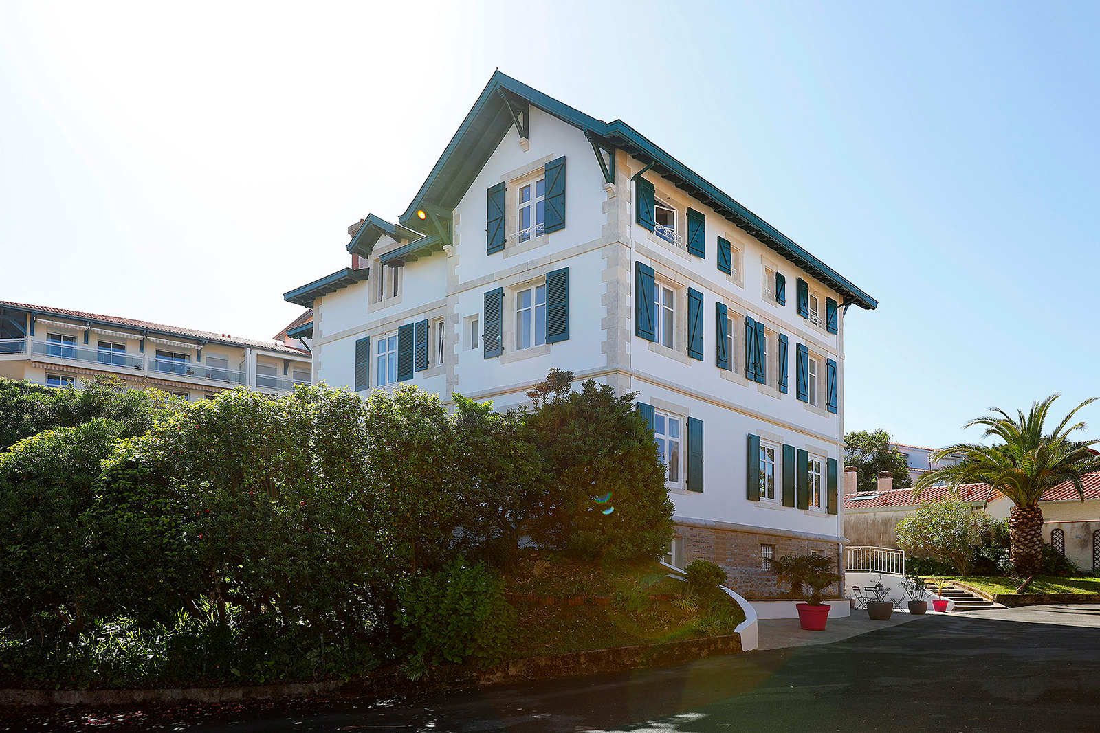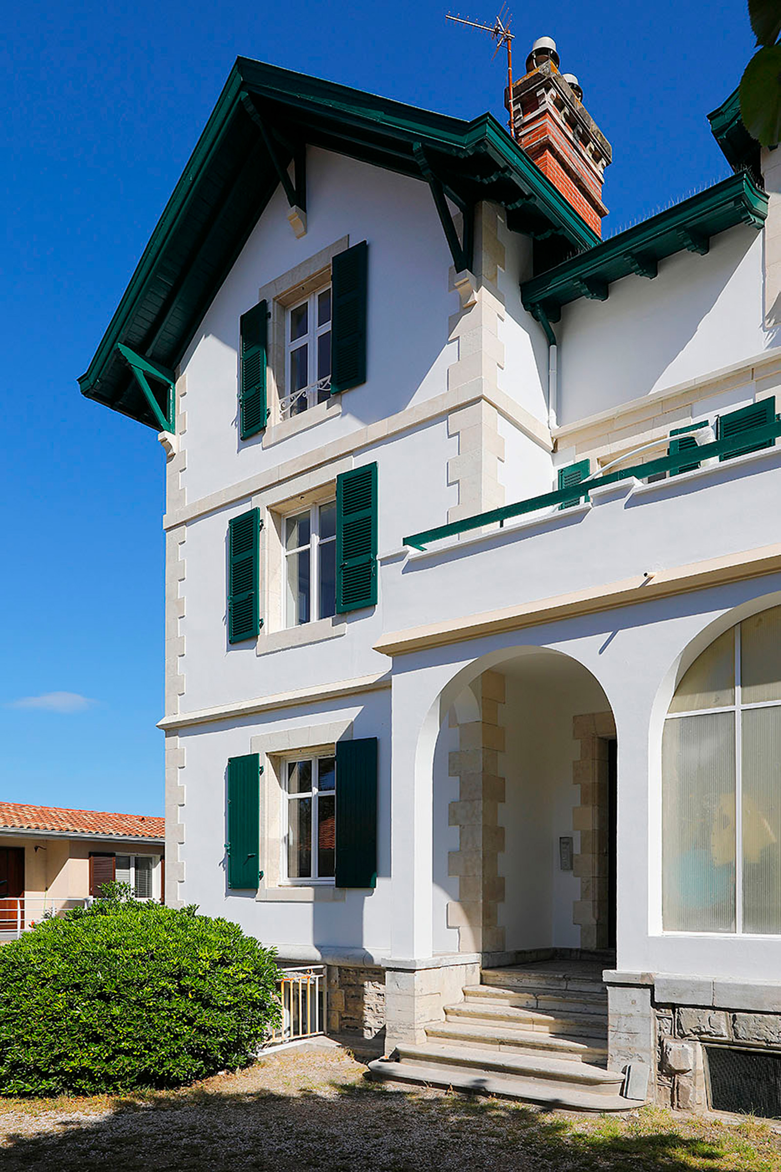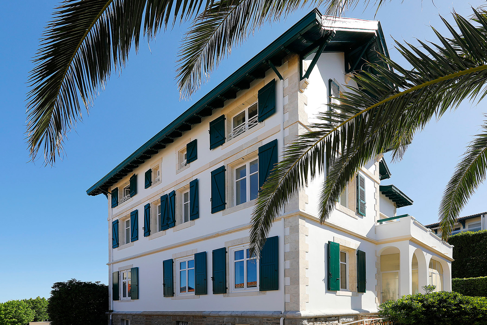 Edificio de viviendas en Biarritz con fachada que presentaba desgaste por el paso del tiempo, con pintura deteriorada y necesidad de reparación en carpinterías y elementos comunes.